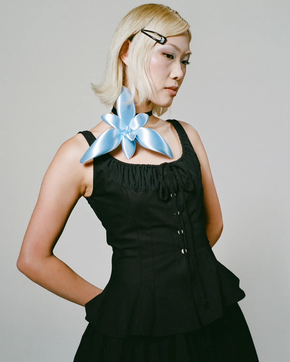 A modern take on Victorian corset covers, a delicate camisole with double-lined cotton chiffon decorates the neckline and shoulders like a veil, made adjustable by a cotton cord resting between the layers. The main body is made of a lightweight cotton poplin, dyed a delicious black licorice color. It boasts several pattern pieces across the front and back to contour the form without being too restrictive, designed to be just a hair more relaxed but still keeping a fitted silhouette.