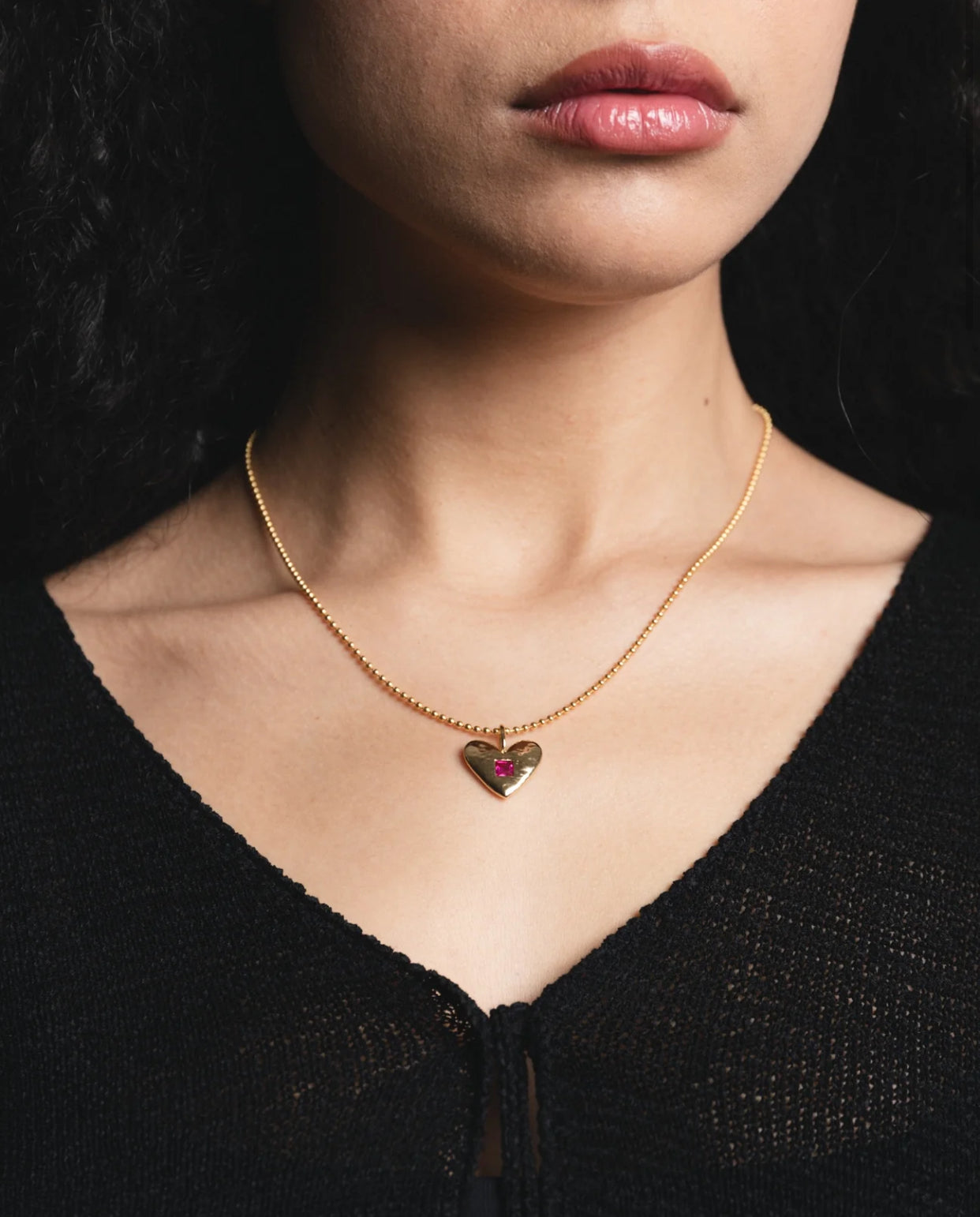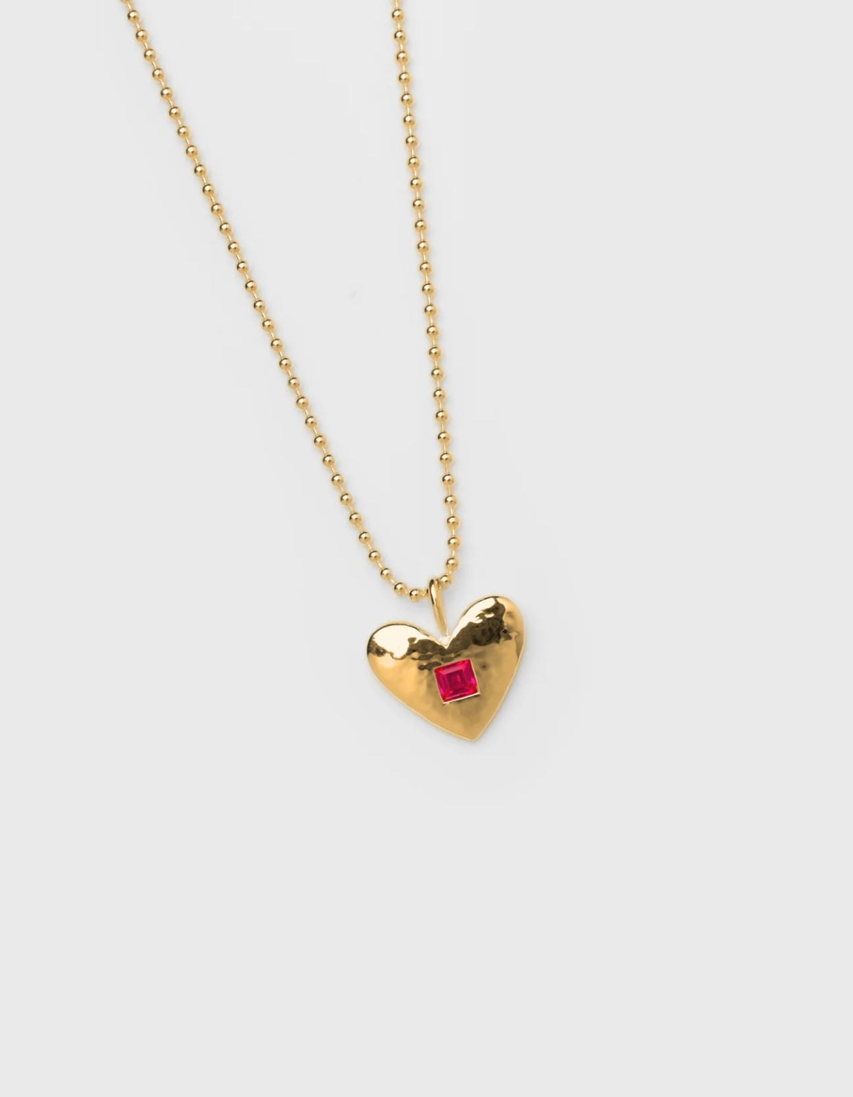 • 14k Gold plated brass heart pendant with lab-created ruby gemstone